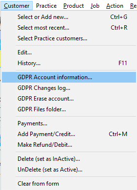 There are a number of options in the Customer menu, for providing GDPR controls for a dentist account.
