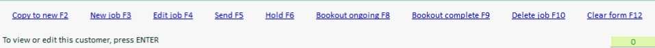 This area shows which actions are available to you depending on the state of the job currently displayed on the main form. For example, if you are entering the details for a new job you will be able to book it in, delete it, produce a quote etc. If you are viewing an existing job that has been booked out and invoiced you will have different choices. This behaviour can be described as "context sensitive", meaning that the options change depending on the state of the job.