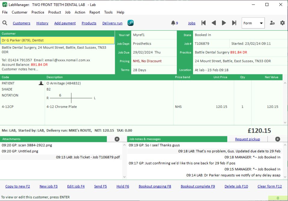 The Main Form displays the job details in a Job Document, including the Customer (dentist), Billing Details, Due Date and State/Dept.