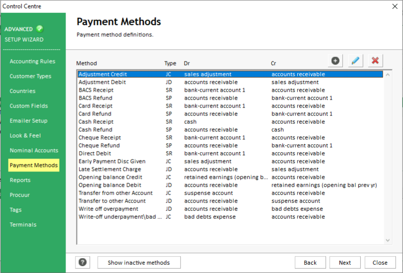 Tools menu > Control Centre > Advanced > Payment Methods.