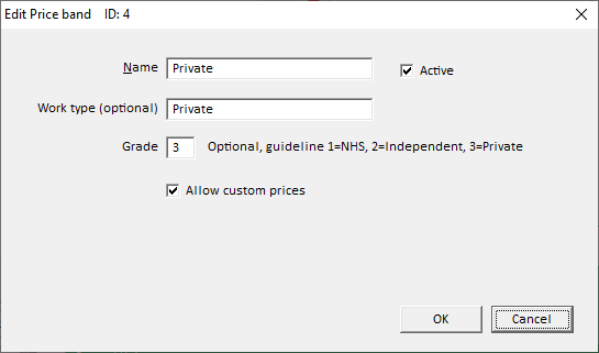 From here you can set up different Price Bands, which would typically be groups of prices. In the LabManager example company, we have set up 4 Price Bands: NHS, Private and Independent, as well as a Cost price band which can be used to track how much a product costs the lab to produce.