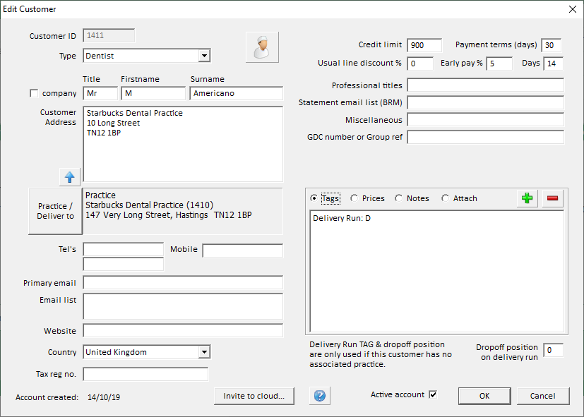 For example, BDS, MBE, BA (hons) etc. These details will appear on statements and invoices next to the customer name, so it is possible to use this field for other purposes, such as a Work Order number or external customer reference number.