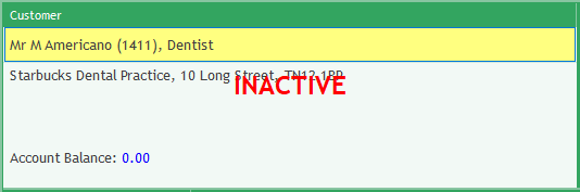 If an inactive customer is selected onto the form (using the account number or by searching for inactive records), then the Main Form will stamp INACTIVE in red across the customer's address.