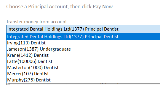 The account you select here acts as an intermediary account for the payment. Put simply, the payment you have physically received from the customer should be added to the account that you select here (the principal account), and the Remitter portions this off to the dentist accounts as appropriate, saving you the bother of doing this manually.