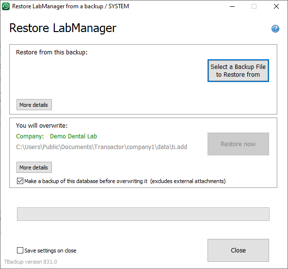 Note that every time you restore from a backup file, you will be wiping and replacing any LabManager data that was already present on that computer.